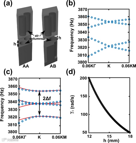 构建合适的声学层间耦合是在双层声子系统中实现魔角的前提条件。为了设计出这样的层间耦合,空气声表面波结构成为了一个合适的选择。在石墨烯晶格排列的单侧开口的周期性空气柱结构中,可以实现类似于真正的石墨烯中的狄拉克锥色散。通过叠放两层这样的空气柱结构并且控制层间距离,可以观察到和AA堆叠或者AB堆叠双层石墨烯中类似的色散能带,由此可以确认层间耦合的强度。