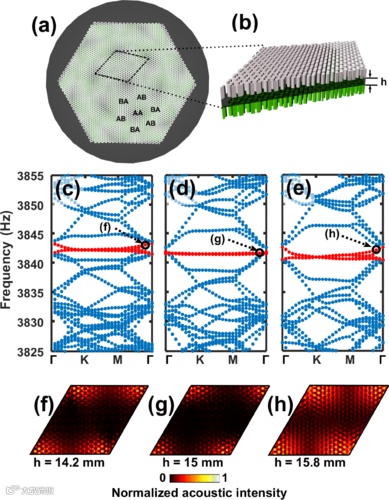 图2. (a) 转角为3. 481°的双层声子石墨烯结构的俯视图。莫尔纹在图中由不同的明暗度区域所构成。 (b) 双层声子石墨烯结构的侧视图。层间距由h表示。(c)-(e)分别为层间距14.2 mm,15mm 和15. 8mm的声子能带。红色能带由狄拉克锥层间杂化形成。(f)-(h) 能带中黑色圆圈的特征态的声能密度分布。