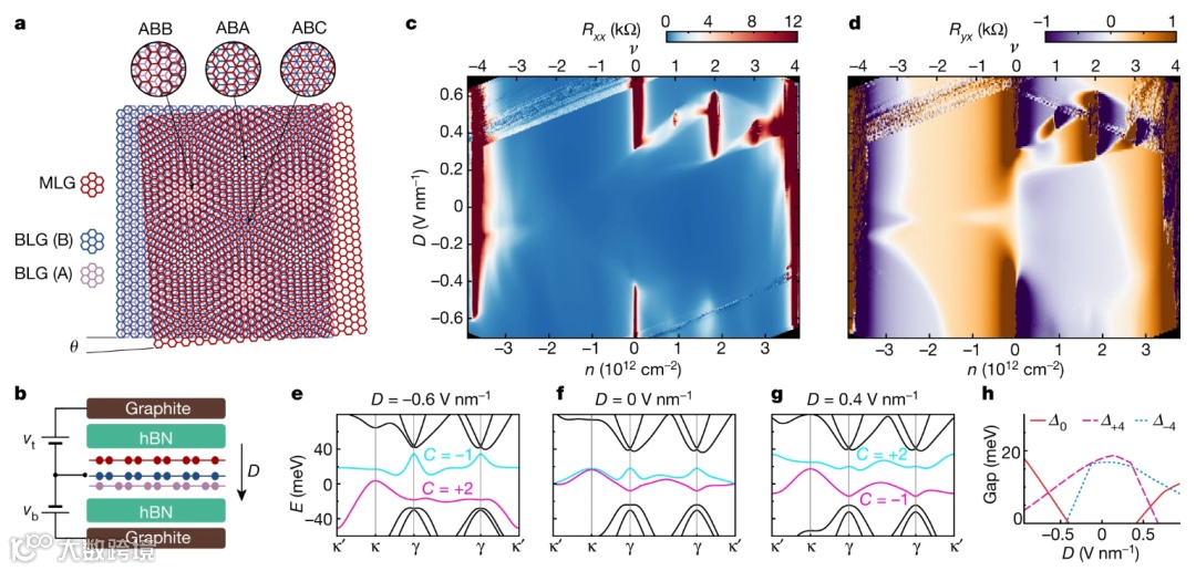 研究人员使用双层旋转堆叠的石墨烯组成的范德华异质结作为研究对象,以实现狭窄且拓扑学上不重要的谷投影莫尔微带。在这些带内,每个摩尔单元晶胞填充1到3个电子时,就能观察到量子反常霍尔效应,其横向电阻大约等于h/2e2(其中h是普朗克常数,e是电子上的电荷),表明系统自发极化为Chern数等于2的单谷投影带。当每个摩尔单位晶胞中填充3个电子时,可以通过对化学势的场效应控制来逆转量子反常霍尔效应的征兆。