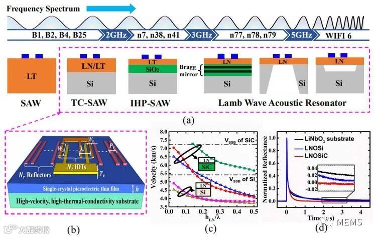 图1(a)SAW滤波器向高频、大宽带方向发展的路线图;(b)基于高声速、高导热压电异质衬底的滤波器芯片示意图;图(b)所示压电异质衬底的(c)声速频散特性曲线仿真结果和(d)瞬态热反射曲线测试结果