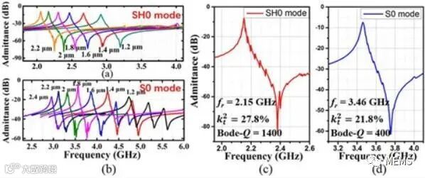 图2(a)和2(b)所示实验结果表明该异质衬底可有效激发SH0模式和S0模式,其对应谐振器的工作频率可覆盖2.0~4.72 GHz频段,机电耦合系数大于20%。通过调整压电薄膜厚度和目标模式波长的比值,可进一步降低或提高器件工作频率和机电耦合系数。图2(c)所示实验结果为典型SH0谐振器的导纳响应,其兼顾较高的工作频率、较大的机电耦合系数和Bode-Q。图2(d)所示实验结果为典型S0谐振器的导纳响应,其谐振频率大于3.3GHz,机电耦合系数大于20%,基本满足5G应用需求,后期将通过器件优化设计提高其Bode-Q。