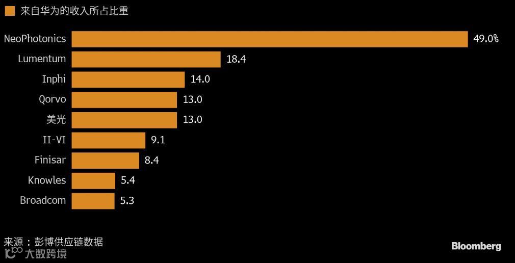 数据显示,光学元件供应商NeoPhotonics的华为业务占比为49%,业务受到影响的程度最大。光学元件供应商Lumentum、数据互联解决方案提供商Inphi、无线设备提供商Qorvo、芯片提供商美光的华为业务占比分别是18.4%、14%、13%、13%,位于受影响较大的第二梯队。光电元件供应商II-VI和Finisar、电子设备提供商Knowles、芯片提供商博通的华为业务占比分别是9.1%、8.4%、5.4%、5.3%,位于第三梯队。