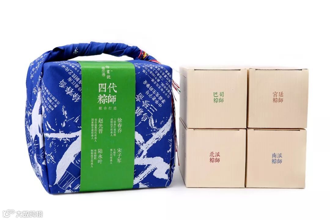 “四代粽师”礼盒的包装非常有意思,特制的方巾裹着来自大江南北的4盒粽子,最后用手工编织的五彩绳缠绕。