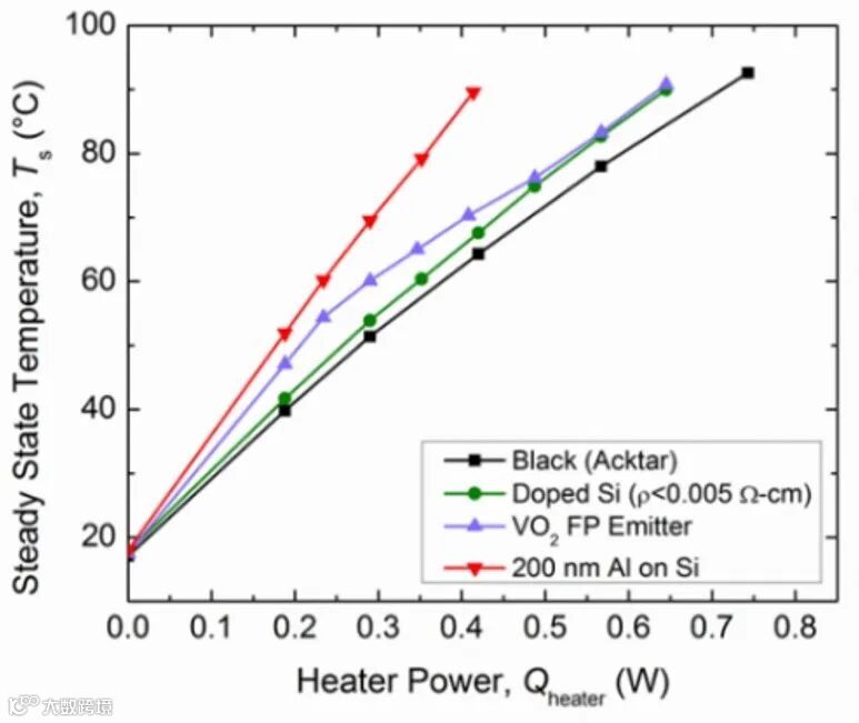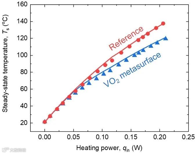 低温低发射、高温高发射的特性表明该材料具有动态辐射热控的能力。为了实验展示这种能力,课题组对样品进行了性能测试。在测试中(见图5),样品被装载在插入了热电偶的铜片上;铜片下方贴有电加热片。测试在真空腔内进行,以隔绝对流的影响。样品通过电加热片的导线悬空,以减小导热热损。以上措施有助于突出辐射传热的作用。通过测量不同电加热功率下的样品温度,VO2超材料的动态辐射热控效果将与对照样品进行比较。对照样品具有与VO2超材料低温态相近的辐射性质,但其发射率不会随温度变化而变化。