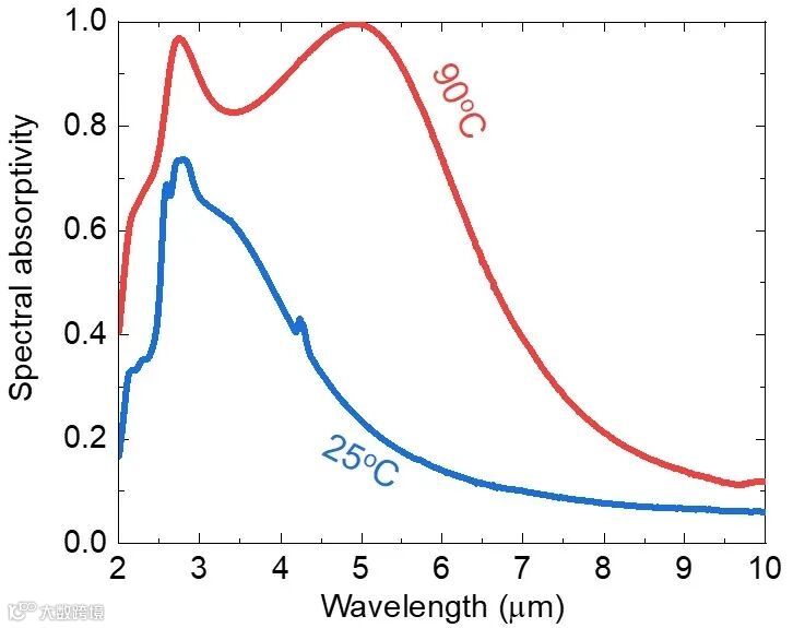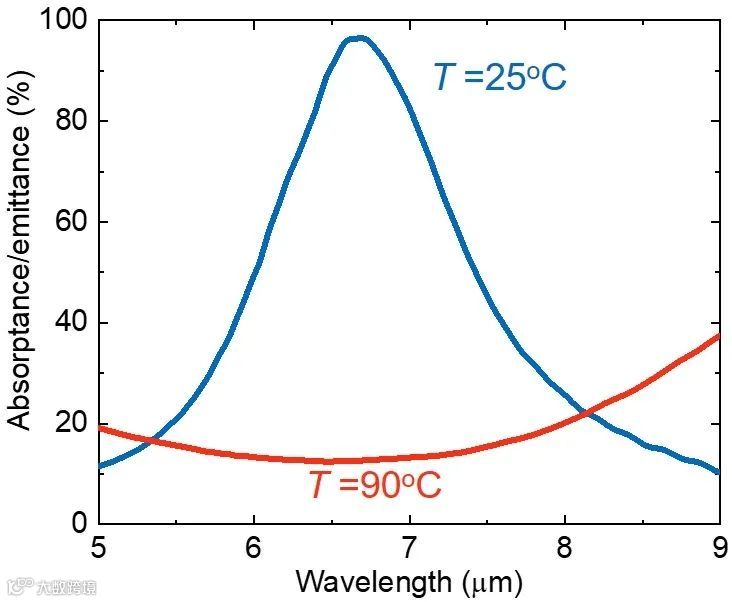 使用微纳加工方法制备了这种VO2超材料并测量了其在不同温度下的辐射性质。从图8可以看出,材料处于室温时呈现明显的发射峰,而当温度超过VO2相变材料之后,该发射峰消失。