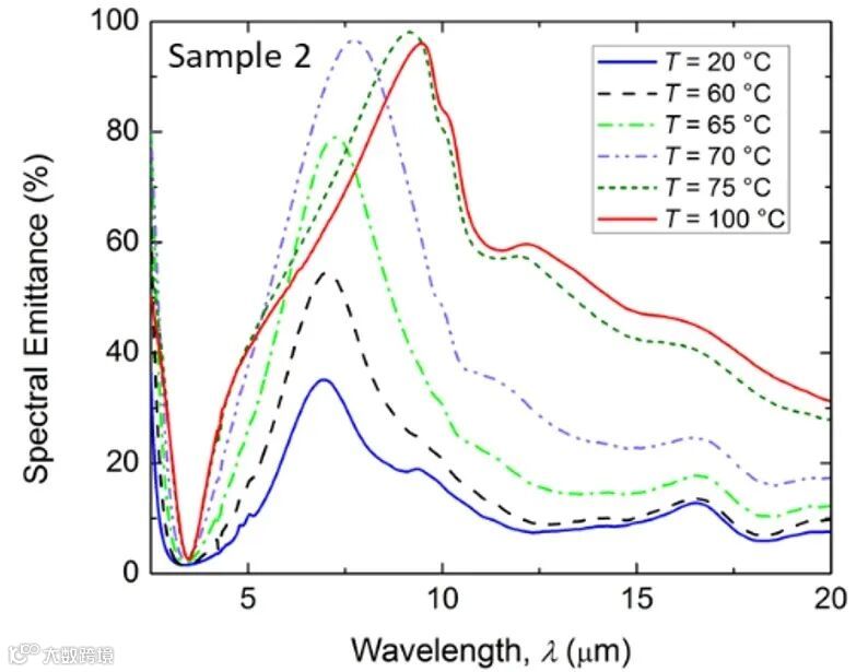 利用多层镀膜技术制备了上述的VO2多层结构,并测量了其辐射性质。图11中的测量结果显示,多层结构处于室温时在2-20微米波长范围内的红外发射率较低。随着温度的升高,结构的发射率逐渐升高,峰值发射率接近100%。这样的高温高发射率、低温低发射的特性使得该多层结构可用于动态辐射热控。