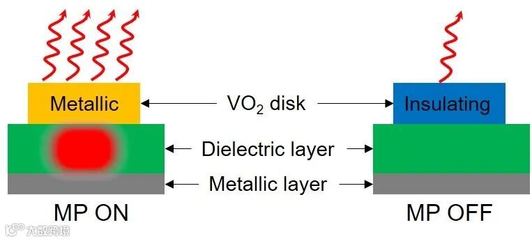 为了使航天器等器件运行在指定的温度范围内,合理的热控手段必不可少。当器件温度较高时,提高器件红外热发射率可以强化辐射传热从而达到散热的目的;而当温度较低时,需要降低发射率来减小辐射热损。为了实现这样的动态辐射性质,王力平课题组提出了通过VO2的相变来激发和抑制磁极化激元 (Magnetic Polariton, MP) 的思路。磁极化激元是结构本身的频率与外加电磁场频率形成共振时产生的一种增强吸收的现象。如图1所示,当温度高于VO2相变温度时,顶部的VO2处于金属态,在中间的介电层中会激发MP,从而在MP的共振频率处呈现很强的吸收/发射。当温度低于相变温度时,VO2处于绝缘态,原有共振频率处的MP不再被激发,吸收/发射就会被抑制。