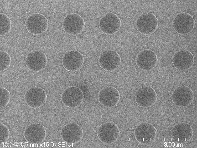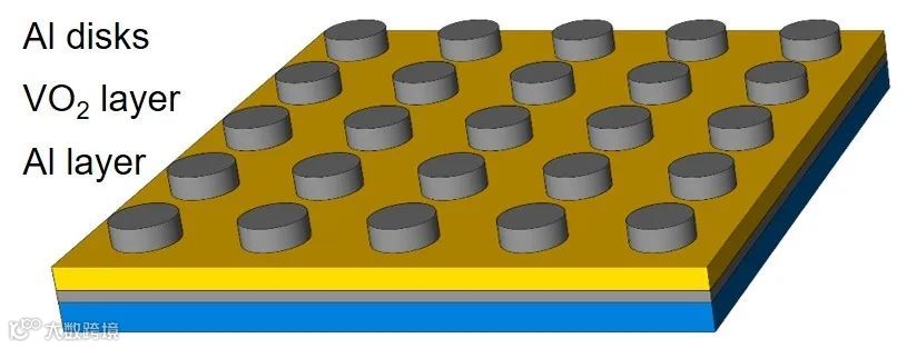 制备的VO2超材料由顶部VO2圆柱阵列(高100纳米)、中间HfO2介电层(厚300纳米)、底部铝层(厚200纳米)和硅基底构成。图3的扫描电镜照片显示VO2圆柱直径1.1微米,阵列周期1.6微米。