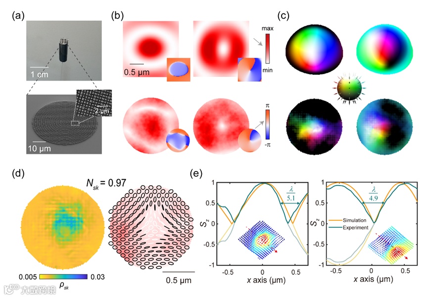 图3 全光纤skyrmion发生器的实验验证:(a)器件实物图及扫描电镜图,(b)模拟(上)和实验(下)的复振幅分布图,(c)Stokes偏振分布图:仿真(上)和实验(下),Skyrmion(左)和Bimeron(右),(d)实验的斯格明子密度分布图(左)和偏振分布图(右),(e)归一化斯托克斯矢量Sz的线图及矢量分布图。