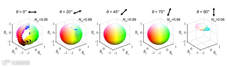 通过调控光纤光源中的线偏振方向,可以实现skyrmion与non-skyrmions光场分布的自由切换控制。在不同线偏振态光源下的skyrmion的斯托克斯庞加莱球分布如图2所示:当偏振态角度在40°- 70°范围内,整个庞加莱球几乎被完全覆盖,斯格明子数(skyrmion number)接近于1(即理想状态),这意味着在实际应用中无需严格对准偏振态方向也可获得高质量的skyrmion。而若将入射光纤光源偏振态调节为0°或90°,此时斯格明子数接近于0,表现为non-skyrmion态。因此调节光纤光源偏振态可实现对skyrmion的开关控制,有望通过全光纤系统实现高速调控。