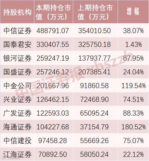 今年一季报中,中信证券持股市值达48.88亿元(4月30日收盘,下同),排名第一,比上期增加38.07%;第二名是国泰君安,持有市值达33.04亿元,增加1.43%;第三名国盛证券持有市值达25.72亿元,增加24.04%。