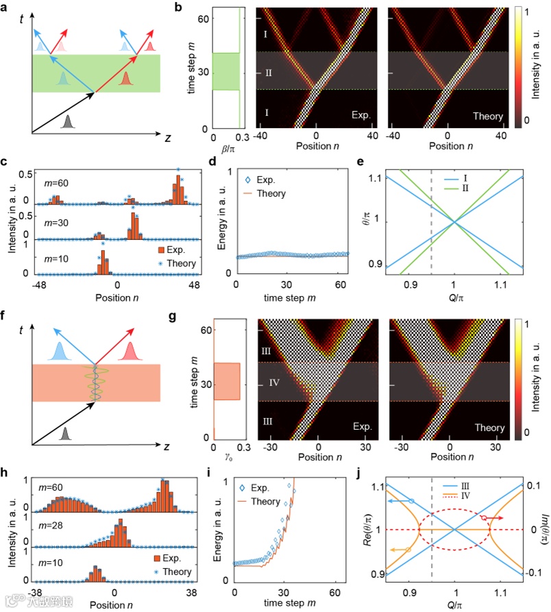 图2动量带隙内脉冲传播。(a)动量带隙内时间折射和时间反射行为的示意图。(b)参数β关于时间的函数(左图)、测量的脉冲传播(中图)和计算结果(右图)。(c)在m =10、30和60时的脉冲强度分布。(d) 脉冲的总能量。(e) 不同时段的能带结构。 (f) 动量带隙中时间折射和时间反射行为的示意图。(g) 参数γ0关于时间的函数(左图)、测量的脉冲传播(中图)和计算结果(右图)。(h)分别在m =10、28和60处的脉冲强度分布。(i) 脉冲的总能量。(j)不同时段的能带结构。