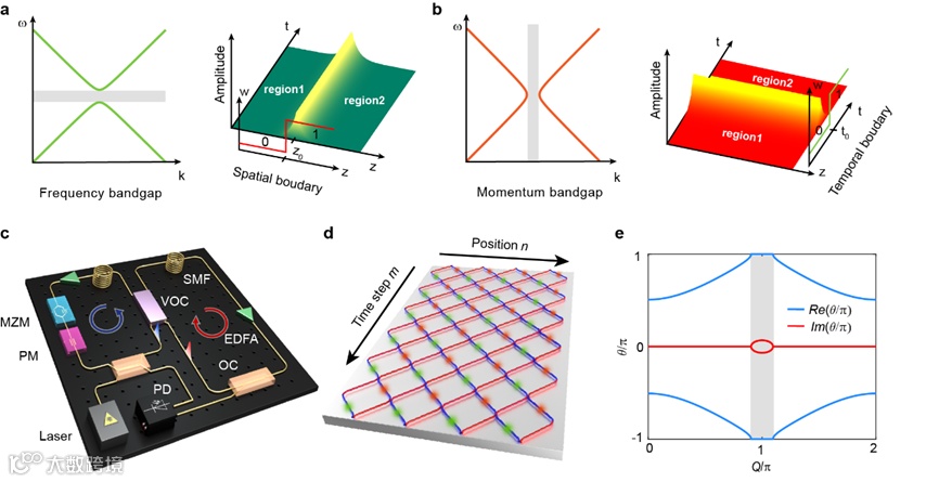 在该工作中,研究人员利用由两个光纤环互相耦合而组成的光学系统(图1c),实验观测到了动量能隙中的拓扑相。实验中的光学系统可以被映射到一个大规模的时间合成晶格(图1d),这个晶格具有Bloch动量带结构,并包含一个完整的动量能隙(图1e)。在此基础上,团队首先分别实验验证了动量带和动量带隙内两种情况下光的时间折射和时间反射行为,并观测到了动量带隙中指数增长的模式(图2)。动量带隙拓扑可以从准能量