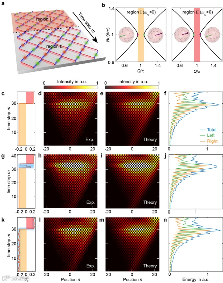 附近的有效动量算符来理解:在两个具有不同动量带隙拓扑的子系统之间,存在一个零动量的时间拓扑边界态解。通过突然改变晶格的参数,研究人员构造了拓扑时间界面,并实验观测到了能量在界面处的时间边界态:在到达时间拓扑界面之前,能量指数增长;经过时间拓扑界面之后,能量指数衰减(图3)。