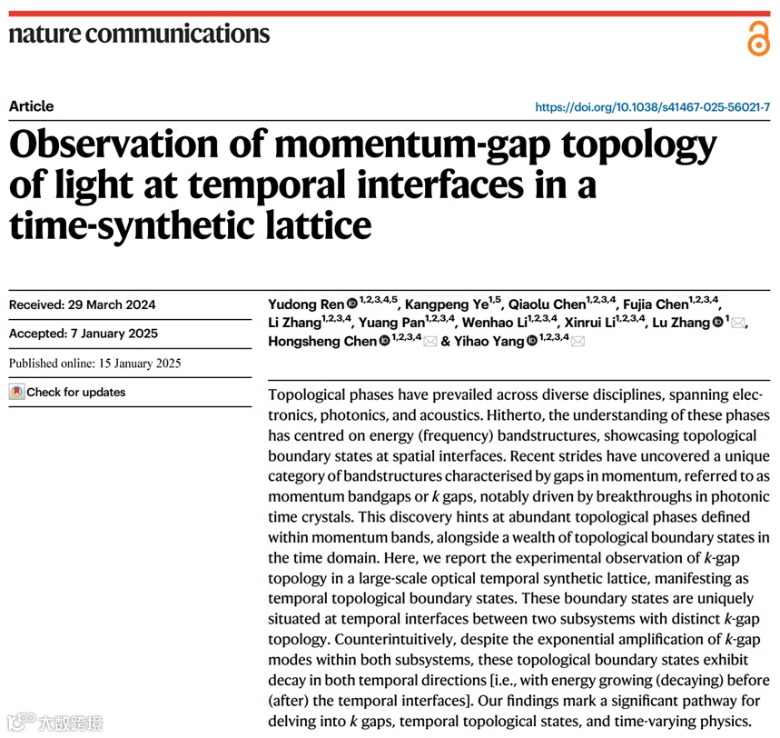 该工作通过直接观察大规模光学时间合成晶格中的时间拓扑边界态,首次实验证实了动量带隙的拓扑性质。此外,该工作还实验展示了动量带隙模式在经过时间板时的传播动力学,阐明了它们在时间边界处的时间折射和时间反射现象。实验中所利用的时间合成维度不仅为探索与动量带隙相关的非常规物理现象提供了一个良好的平台,还为研究非线性效应、无序等因素与动量带隙之间的相互作用提供了新的途径。
