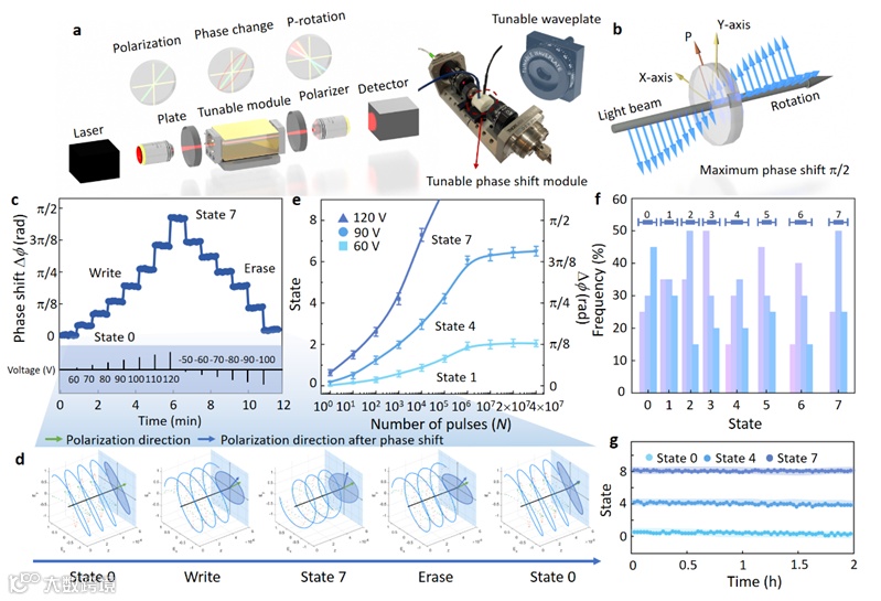 图3. 非易失性电光可调波片的特性表征。a) 作为可调相移模块的 PMN - PT 的光路示意图。插图展示了一个商用可调波片和一个电光可调相移模块,其中电光模块具有更灵活的电子调谐模式。b) 可调模块产生最大相移为 π/2 时光偏振的示意图。c) 在一系列不同幅度的脉冲作用下,PMN - PT 晶体中的相延迟曲线,包括写入和擦除过程。d) 当产生不同的相延迟时,通过偏振器检测 PMN - PT 出射光的偏振态变化。e) 脉冲数量与电光状态之间的关系曲线。f) 102 个周期内误差范围内电光状态出现的频率。g) 2 小时内电光状态的连续稳定性演示。