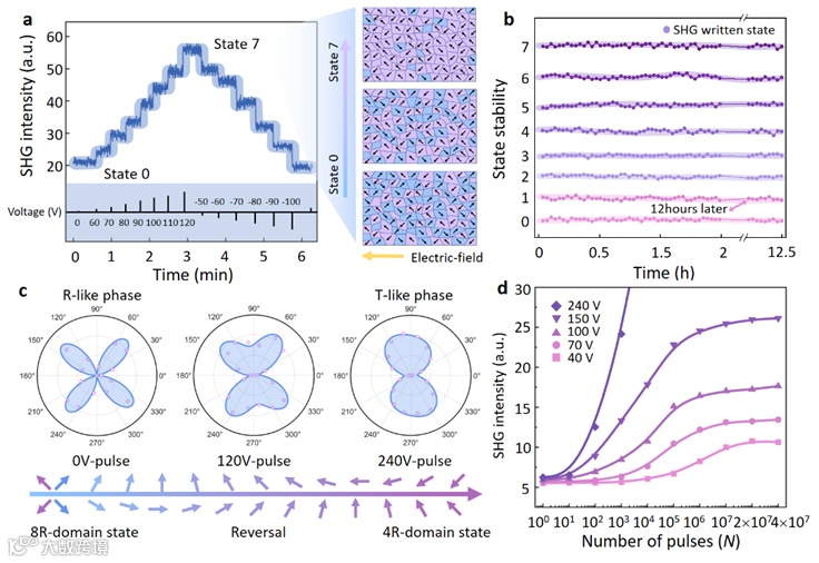 图2. 二次谐波产生(SHG)的非易失性多级行为。a) SHG 强度曲线随不同幅度的脉冲而变化。b) SHG 多级写入状态和0状态的稳定性超过12小时。c) SHG 偏振模式显示在脉冲场的影响下,类R相的 PMN-PT 逐渐转变为类T相。d) SHG 强度与脉冲数量的关系曲线。
