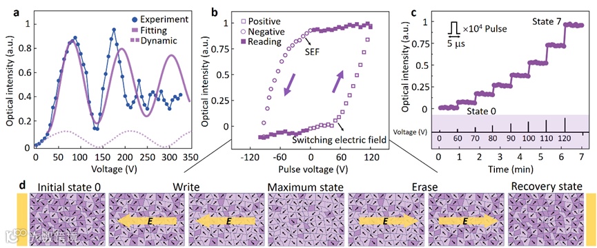 图1. 非易失性多级存储的电光响应与现象。a) 采用直流偏置驱动PMN-PT晶体时,光强与所施加偏置的关系。虚线为通过动态方法转换得到的半波电压曲线。b) 光强与脉冲幅度的关系。“读取” 范围表示在施加最大幅度脉冲后,停止脉冲,仅读取状态,然后施加反向脉冲。c) 通过施加不同幅度的脉冲获得多个光强状态,并且在脉冲停止后这些光强状态得以维持。d) 不同幅度脉冲下的畴转换简化示意图,通过写入和擦除过程改变 PMN-PT 晶体的双折射。