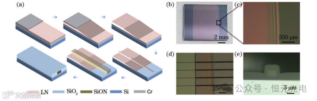 图7 晶圆片制备流程及局部显微镜图。(a)端面耦合器主要制备流程;(b)抛光后的晶圆片在(c)斜坡区域放大图像中存在高度差;(d)被氮氧化硅波导覆盖着的铌酸锂楔形波导区域;(e)端面处显微镜图像