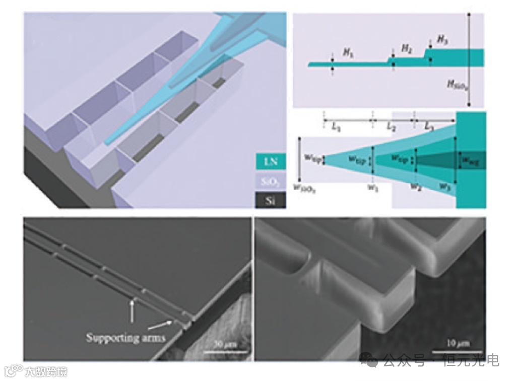 中山大学蔡鑫伦课题组设计的三层倒锥形结构端面耦合器,结构如下图所示。该耦合器由三层不同末端宽度的倒锥形铌酸锂波导和包覆在铌酸锂波导外的SiO2弱波导构成。通过PECVD工艺形成SiO2覆盖层后,通过氟化氙(XeF2)或六氟化硫(SF6)对Si衬底进行各向同性的干法刻蚀,使下层热氧化层SiO2悬空,与上层通过PECVD 工艺形成的SiO2包层共同形成带波导,而铌酸锂三层倒锥波导被SiO2带波导包裹在中间,当光从光纤耦合进SiO2弱波导后,会通过锥波导逐渐束缚至铌酸锂脊波导中。该设计实现了1550nm与775nm双波段的高效耦合,耦合损耗分别低至1dB/facet和3dB/facet。