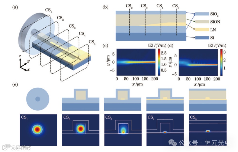 图 6 楔形波导端面耦合器基本设计。(a)端面耦合器整体结构示意图;(b)端面耦合器侧向截面图;氮氧化硅模式耦合至铌酸锂波导模式(c)俯视图和(d)侧视图时域场分布;(e)端面耦合器不同横截面处结构及对应的模式分布