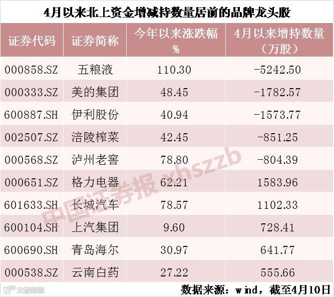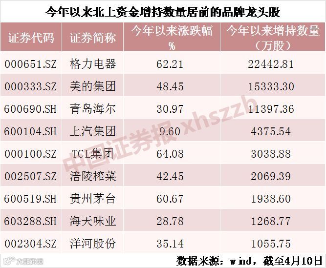 今年以来白马股的一路上涨和北向资金的持续买入不无关系。以品牌龙头板块为例,Wind数据显示,截至4月10日,26只成分个股中,北向资金今年以来净增持的有19只,占比达73.08%。对格力电器、美的集团、青岛海尔、贵州茅台、涪陵榨菜等个股的增持量都超过1000万股。
