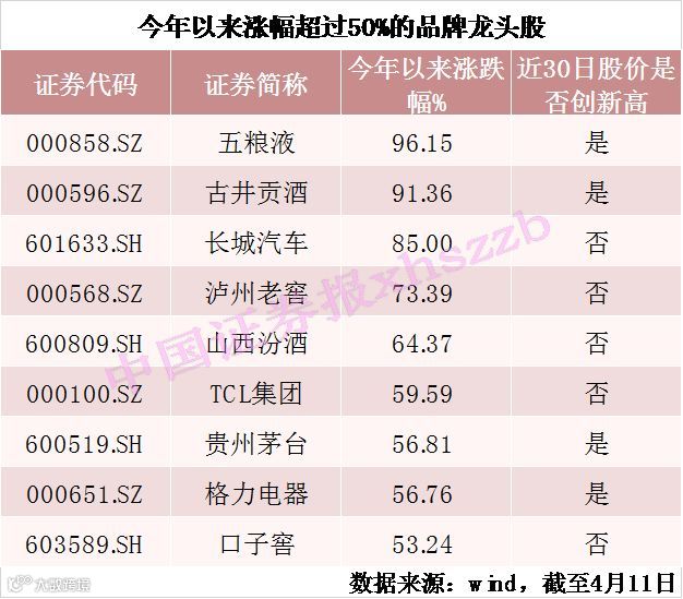 个股方面,截至4月11日,五粮液、古井贡酒、泸州老窖等9只个股涨幅超50%,另有7只个股在近30日中股价创历史新高。