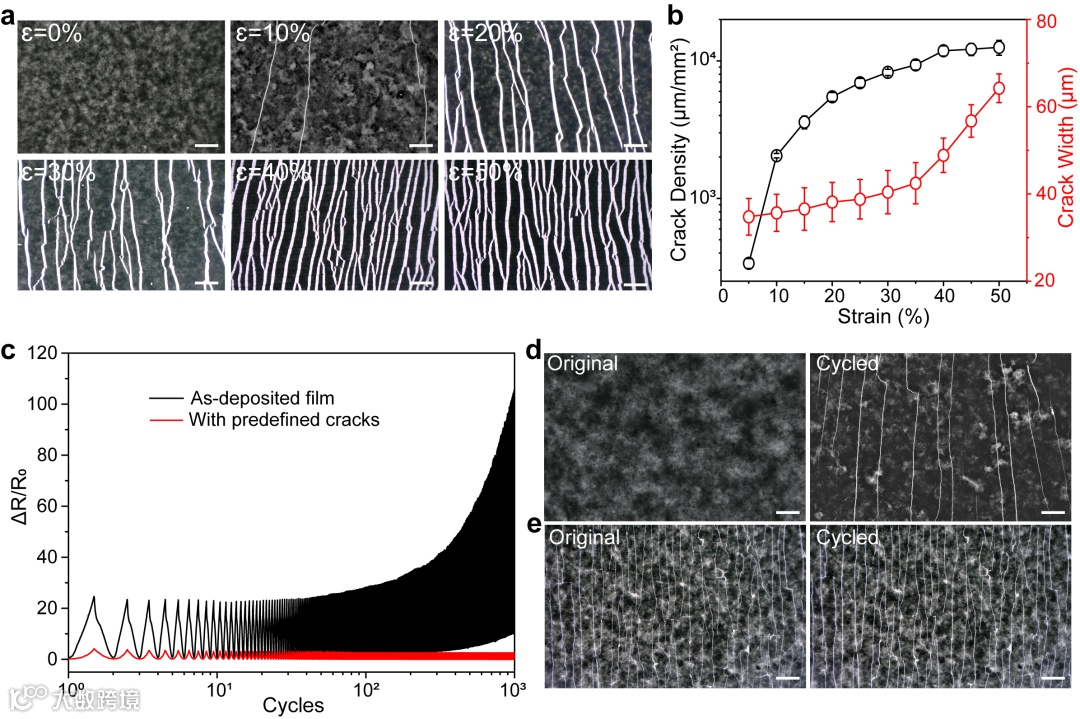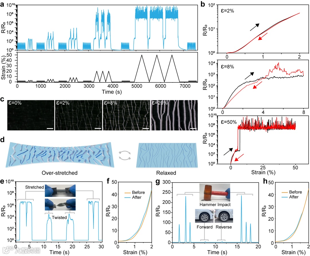 针对以上问题,近日,南京大学陆延青教授和孔德圣教授团队报道了一种具有自修复机制的MXene裂纹式应变计,能够有效耐受应变过载。本研究所制备的MXene薄膜具有饱和微裂纹,这是通过将薄膜在较大应变条件下进行多次循环所形成的。该MXene应变计在0.6%的应变范围内具有高达28629的应变系数。值得注意的是,MXene应变计能够耐受恶劣的工况条件,在经历大范围拉伸、扭曲、锤击和汽车碾轧后,其传感性能都能够迅速恢复,具有突出的鲁棒性。MXene应变计在疲劳测试中表现出稳定的响应特性。如图1e所示,柔性应变计在1%应变下进行了5000次拉伸循环的疲劳试验,表明它在受控环境中使用的可靠性。MXene薄膜被拉伸至50%应变三次,以此产生稳定的微裂纹形貌(图2a)。图3g记录了应变计在锤击和重载荷下的响应,这代表了在实用环境下的经历应变过载,在一段时间后恢复其原始响应特性(见图3h)。这些发现表明弹性微裂纹MXene薄膜的显著抗损伤性,这是由其硅橡胶基底的机械回弹,驱动薄膜的微观结构实现自修复而实现的。相较而言,热塑性聚氨酯(TPU)和苯乙烯-异戊二烯-苯乙烯(SIS)等弹性体,在大的拉伸后会显示出塑性伸长,无法重复修复裂纹传感器的微观结构。这些结果显示,具有低机械迟滞、低残余应变和微小塑性变形的弹性体基底对于实现机械驱动的自愈行为至关重要。
