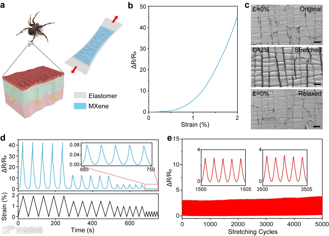 近年来,柔性可拉伸电子的飞速发展推动了可穿戴设备的蓬勃发展,其中可拉伸应变传感器在近年来得到了广泛的研究。其中能够在小应变下达到高灵敏度的,通常被称为应变计。传统的应变计依赖于刚性聚合物基板上的金属薄膜的压阻性,它们有限的灵敏度和高刚度使它们与可穿戴应用不太兼容。受到蜘蛛的裂隙器官的启发,基于裂纹的应变计被认为是一种用于检测微小变形的高灵敏装置,但其突出的性能依赖于精细的微观结构,在实际使用中容易在复杂外力作用下超过其量程范围,产生不可逆的损伤。目前报道的具有高灵敏度的应变计在实际环境中普遍缺乏鲁棒性。