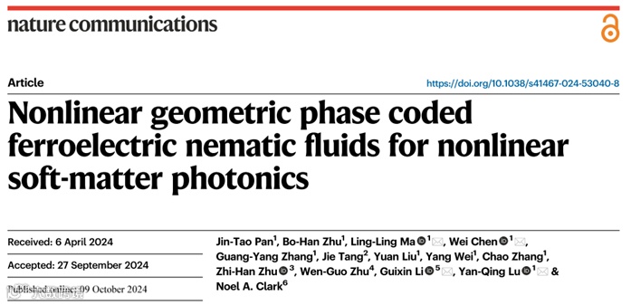 J.-T. Pan, B.-H. Zhu, L.-L. Ma. et al. Nonlinear geometric phase coded ferroelectric nematic fluids for nonlinear soft-matter photonics[J]. Nature Communications 15, 8732 (2024).