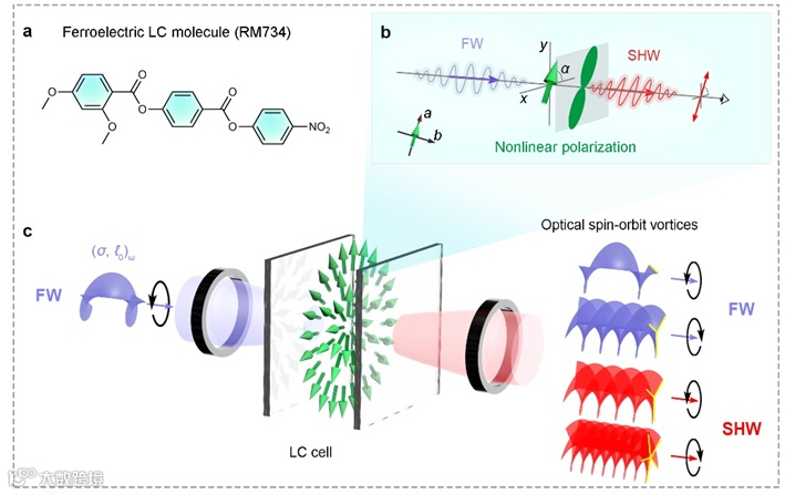 通过对自发极化液晶分子的可编程图案化操控,可以进一步设计所产生的非线性极化场。如图2b所示,研究人员以具有中心拓扑特性的铁电向列相液晶q板为例,揭示了倍频过程中的自旋-轨道耦合。在该器件中,空间变化的液晶指向矢分布遵循以下方程