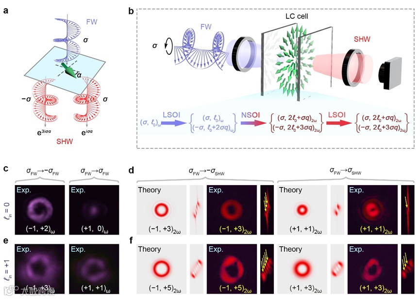 随后,研究人员进一步探究了该液晶体系中特有的级联式线性/非线性光学自旋-轨道角动量相互作用现象,揭示了铁电向列相液晶在圆偏振飞秒激光泵浦下的非线性几何相位编码原理。如图3a所示,在圆偏振飞秒激光泵浦下,当铁电向列相液晶极化矢量绕着z轴逆时针方向旋转α时,所激发的左右旋圆偏振倍频光将携带不同的非线性光学几何相位,其中,具有与基频光同自旋态