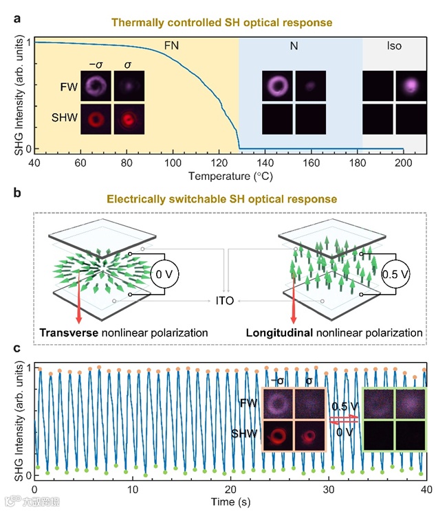 图4. 热场和电场驱动下的动态非线性光场调控。FN:铁电向列相。N:向列相。Iso:各向同性相。