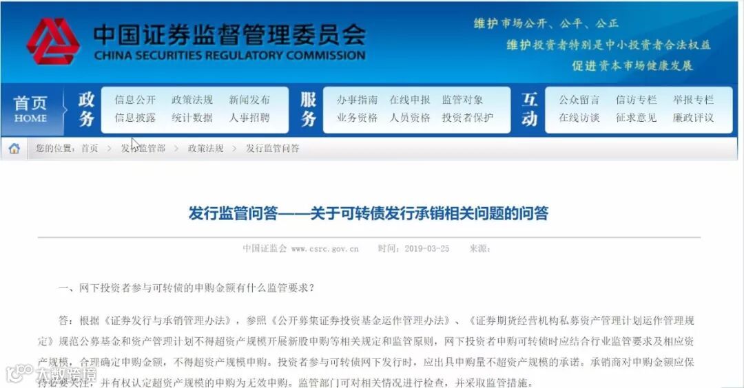 3月25日,监管部门发布《发行监管问答——关于可转债发行承销相关问题的问答》,要求参与可转债网下申购的每个配售对象只能使用一个证券账户,并且不得超资产规模申购。