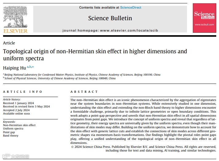 Haiping Hu. Topological origin of non-Hermitian skin effect in higher dimensions and uniform spectra. Science Bulletin, doi: 10.1016/j.scib.2024.07.036