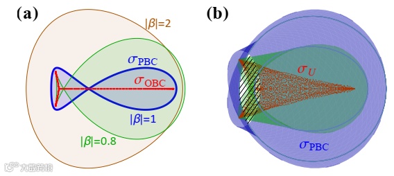 非厄米体系能谱对边界条件的高度依赖性。左图中,一维非厄米系统在周期性边界条件或开放边界条件下的典型能谱表现为带有谱卷绕的环(蓝色)或无卷绕的弧(红色)。右图中,高维非厄米体系的非布洛赫能谱(红色)可通过消除谱卷绕从周期性边界条件下的能谱(蓝色)导出。