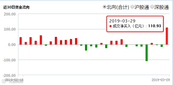 Wind数据显示,北上资金今日净流入110.93亿元,创2019年以来新高。其中,沪股通净流入66.89亿元,深股通净流入44.04亿元。
