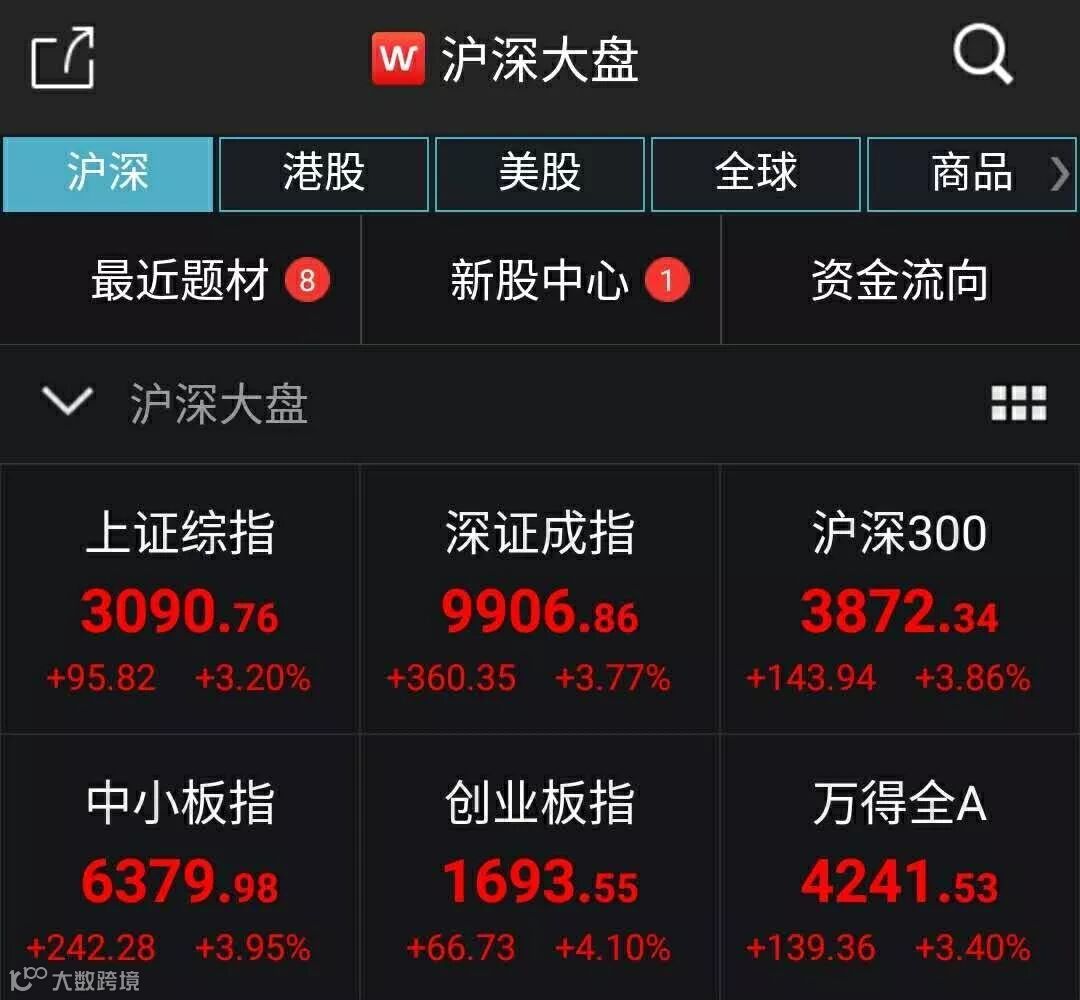 29日,A股单边上行,做多氛围浓厚。截至收盘,沪指大涨3.2%,创今年以来的第二大单日涨幅;深证成指涨3.77%,创业板指涨4.1%,两市成交8363亿元。北向资金全天净流入110亿元,创近4个月新高。