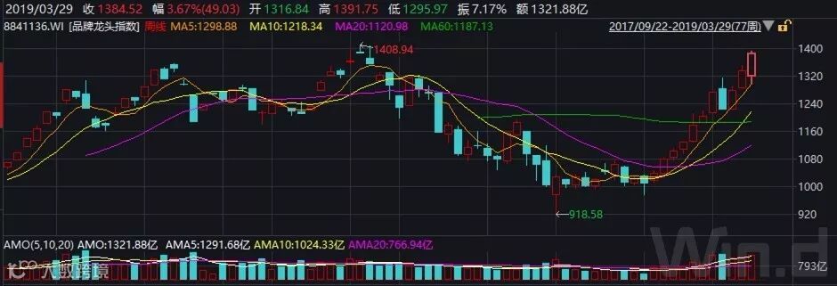 Wind数据显示,品牌龙头指数今日上涨3.79%,收盘报1384.52,逼近前期历史高点。