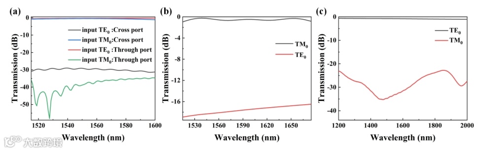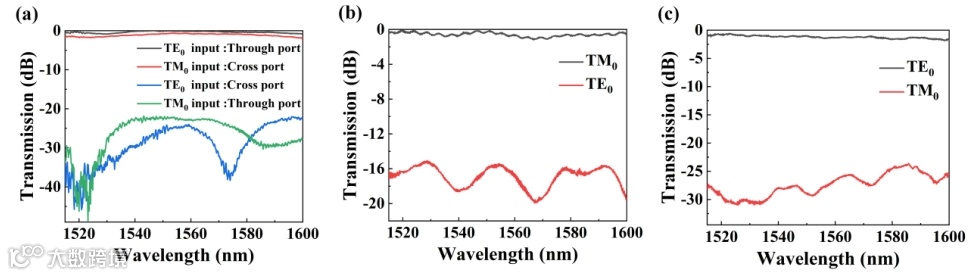图3.所提出的(a)偏振旋转分束器, (b)偏振旋转器,(c)起偏器的测试传输光谱。