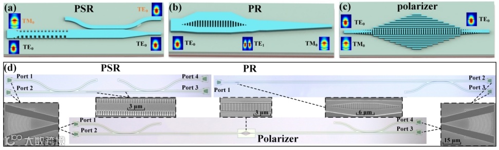 图1.(a)基于光子超材料的偏振旋转分束器。(b)基于光子超材料的偏振旋转器。(c)基于光子超材料的起偏器。(d)偏振操控器件的显微镜图及扫描电子显微镜图像。