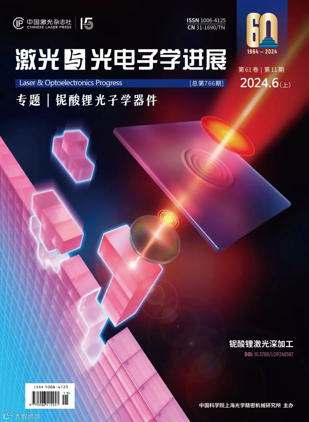 《激光与光电子学进展》于2024年第11期(6月)推出创刊六十周年系列专题之“铌酸锂光子学器件”,本封面为南京大学张勇教授课题组特邀论文“像差预补偿的铌酸锂晶体内部激光直写”。