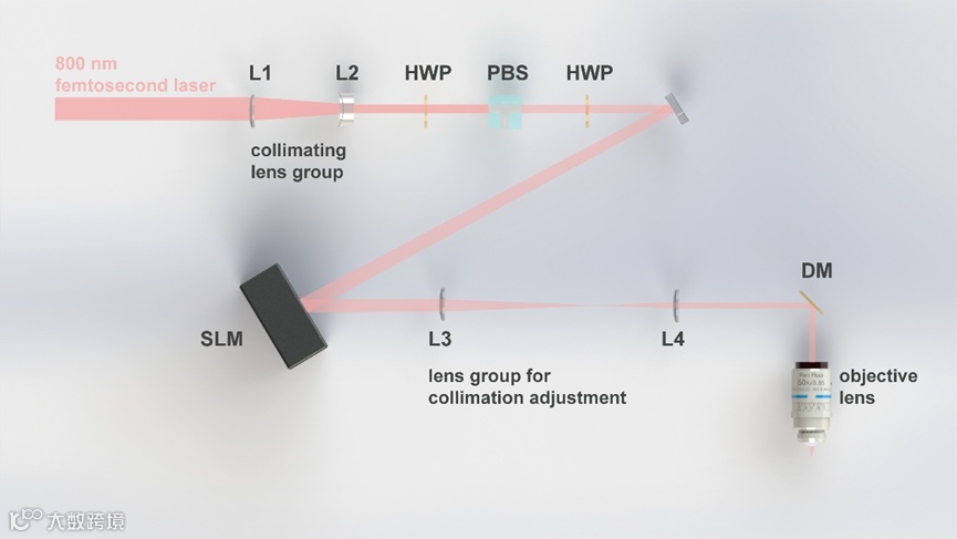 为此,我们设计并搭建了基于液晶空间光调制器的像差预补偿飞秒激光直写系统,激光放大器输出的飞秒激光脉冲经缩束透镜组准直缩束后匹配空间光调制器的有效作用窗口。经调制后的激光光束再次经过准直透镜后匹配物镜系统的后端镜,以充分利用物镜的聚焦能力。随后,激光光束聚焦于电控位移台承载的铌酸锂晶体样品内进行高精度的激光直写。