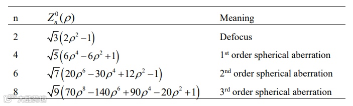 表1 n 阶0类泽尼克多项式的公式表达及物理意义