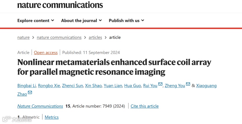 清华大学精密仪器系尤政教授课题组开发了基于非线性超材料的并行磁共振成像增强方法。该研究提出了一种由非线性元胞组成的非线性超材料,旨在选择性增强磁共振成像(MRI)中的射频接收场,并与商用表面接收线圈阵列集成使用;实验验证了该超材料可实现表面线圈MRI与并行磁共振成像(pMRI)的信噪比增强。相关成果以“Nonlinear metamaterials enhanced surface coil array for parallel magnetic resonance imaging”为题在期刊Nature Communications(《自然通讯》)上发表。