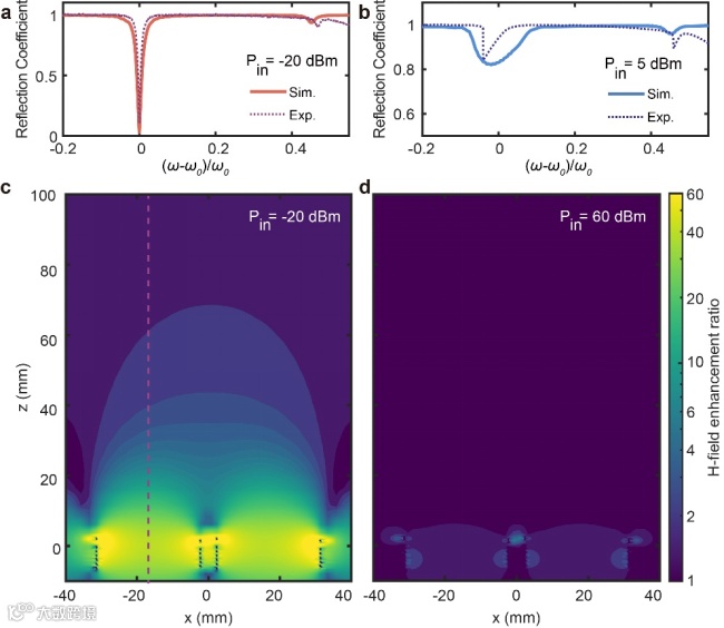 图3 (a, b) 低功率和高功率激励下的频率响应。(c, d) 低功率和高功率激励下磁场增强倍数的仿真分布图。