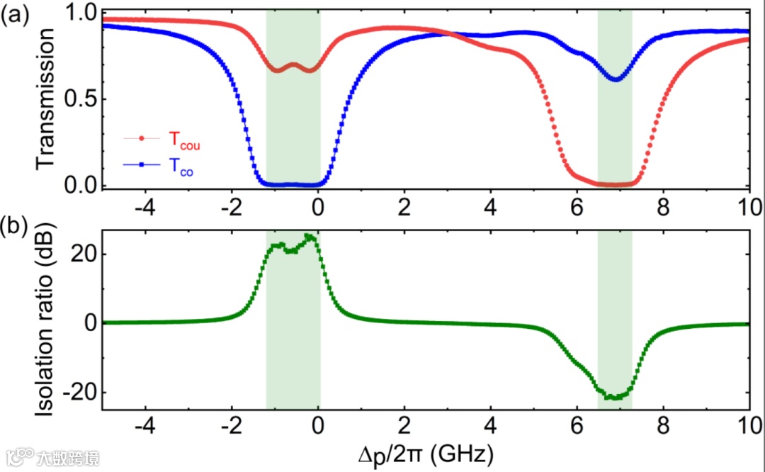 图2 双向隔离的实验结果。(a)画出了探测光的透过率谱,探测光失谐扫描范围为从−5 GHz到10 GHz,蓝线表示同向传输的情况,红线表示反向传输的情况。(b)是对应的隔离度。阴影部分对应隔离度高于20 dB的频率范围。