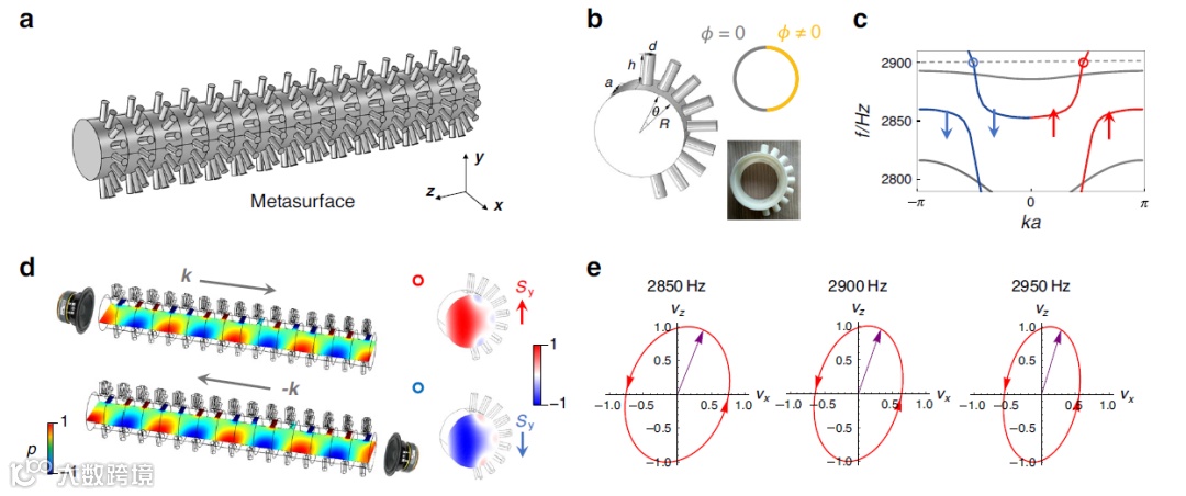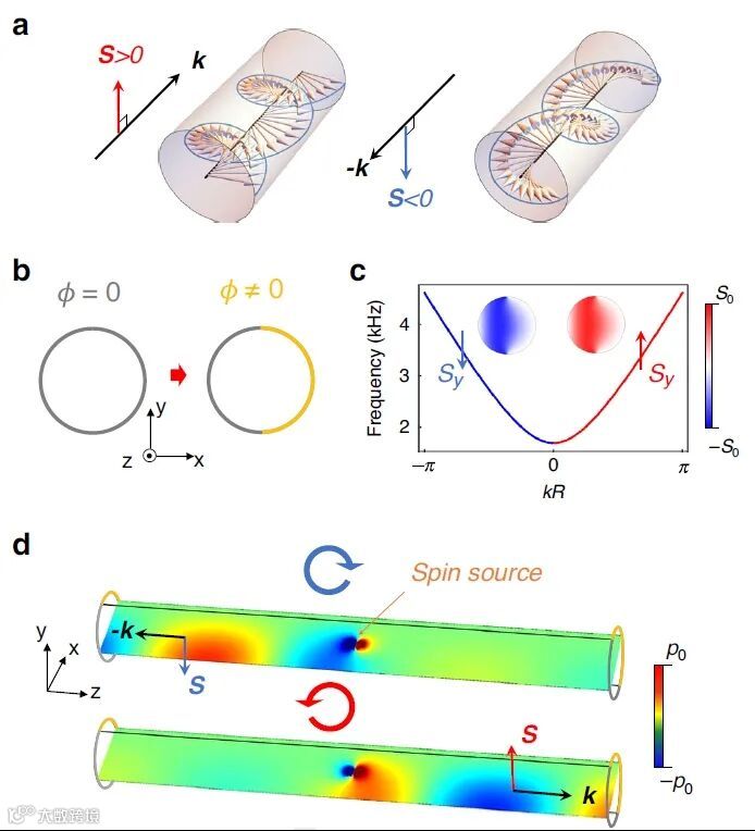 d 在2.9 kHz时,不同传播方向的波导模式具有相反的自旋角动量。