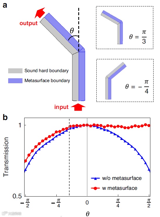 a弯曲角不同的超表面边界波导管。这里给出了两种带角缺陷弯曲结构的弯曲情况。灰色和蓝色分别表示声硬边界和反射相位不同的理想超表面边界。