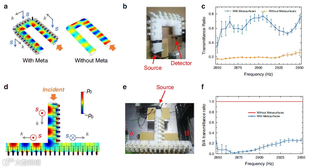 b实验设置。用声源激发波导模,用声波探测器测量压力场。通过计算相同长度的U形波导与直波导的投射率比值得到了透射比。